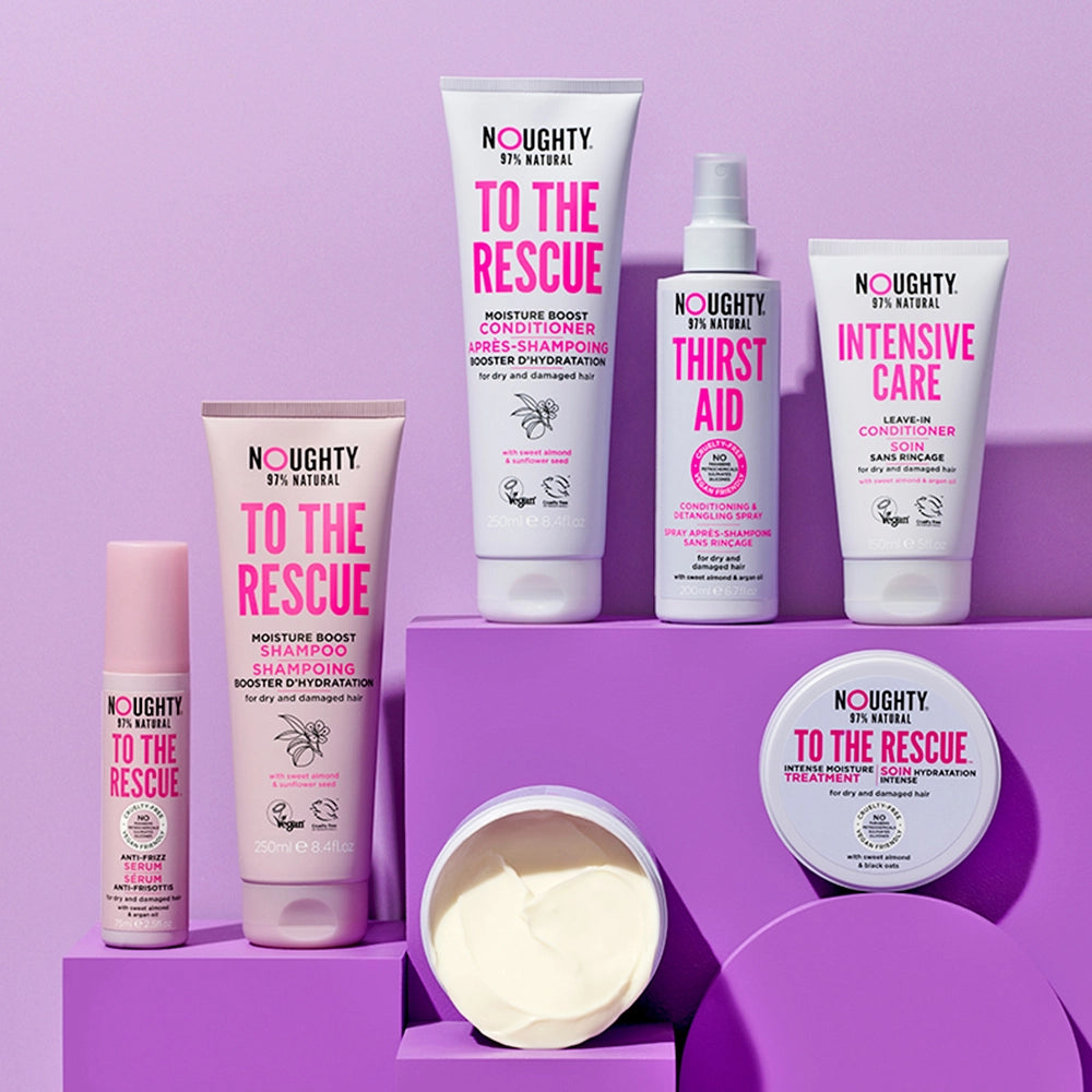To The Rescue Intensive Care Leave-In Conditioner hat eine reichhaltige und cremige Textur, formuliert mit einer super feuchtigkeitsspendenden Mischung, um trockene und matte Haare intensiv mit Feuchtigkeit zu versorgen. Arganöl, Süßmandelöl und Sheabutter zusammen mit Glycerin arbeiten hart daran, Feuchtigkeit im Kortex des Haares einzuschließen und die Haarkutikula zu schützen. Arganöl ist bekannt dafür, das Haar vor oxidativen Schäden zu schützen, die Elastizität zu verbessern und Spliss zu verhindern, während Süßmandel-Extrakt ein nährstoffreiches Öl ist, das Vitamine und Mineralien enthält, die helfen können, die Gesundheit der Haarfollikel zu erhalten und die Haarkutikula zu schützen, sodass das Haar weich und glatt bleibt. Die Königin/der König aller Buttern, Sheabutter, hat eine hohe Konzentration an Fettsäuren, wie Ölsäure und Stearinsäure. Diese essentiellen Fettsäuren helfen, die Kopfhaut und das Haar zu hydratisieren und Trockenheit und Brüchigkeit zu reduzieren. Seine weichmachenden Eigenschaften schaffen eine schützende Barriere, die Feuchtigkeit einschließt, Bruch verhindert und die Elastizität des Haares fördert. Tipp: Ihr Haar wird es Ihnen nach einem Noughty Abend danken!